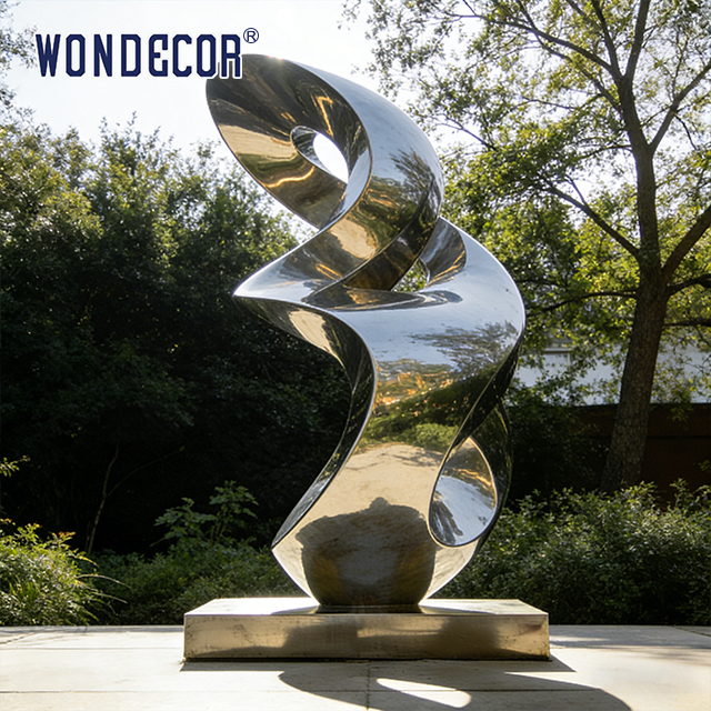 Patung baja tahan karat "Infinite Essence" ini, dengan bentuk simbol tak terhingga yang mengalir, adalah instalasi artistik yang ideal untuk lanskap luar ruangan dan ruang komersial. Dibuat dari baja tahan karat yang dipoles tinggi dengan finishing cermin, patung ini tidak hanya memantulkan tanaman hijau di sekitarnya dan cahaya langit di bawah cahaya alami untuk menciptakan efek cahaya dan bayangan dinamis yang berkembang seiring lingkungan, tetapi juga memiliki ketahanan cuaca yang luar biasa—tahan korosi dan tahan UV, patung ini mempertahankan penampilan yang cerah dan berkilau di luar ruangan selama beberapa dekade dengan perawatan minimal. Garis mengalir minimalisnya berpadu sempurna dengan lingkungan ekologis alami, berfungsi sebagai titik fokus visual yang mencolok sambil menyampaikan konotasi artistik tentang tak terhingga, siklus, dan vitalitas.